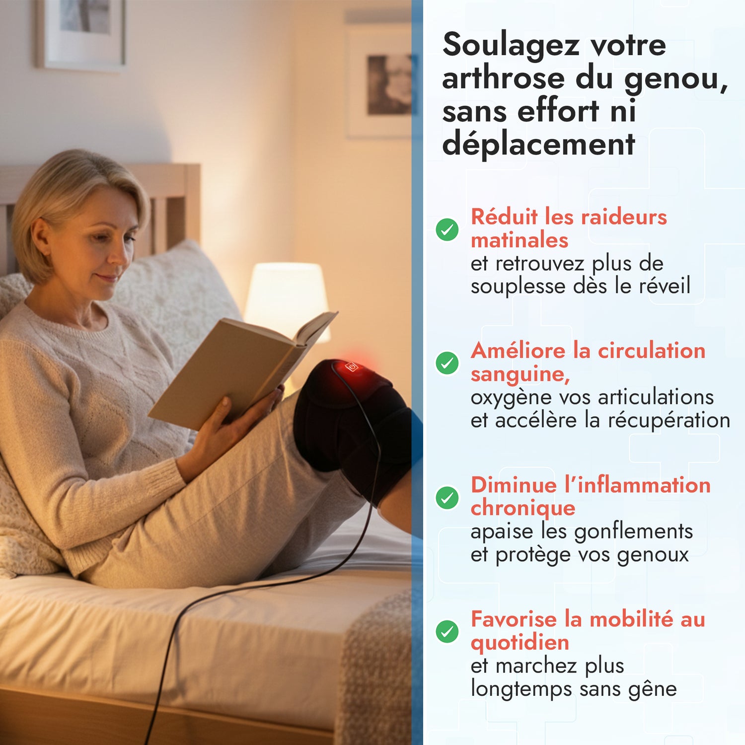 Soulagement naturel des douleurs articulaires de l'arthrose du genou par la chaleur ciblée.