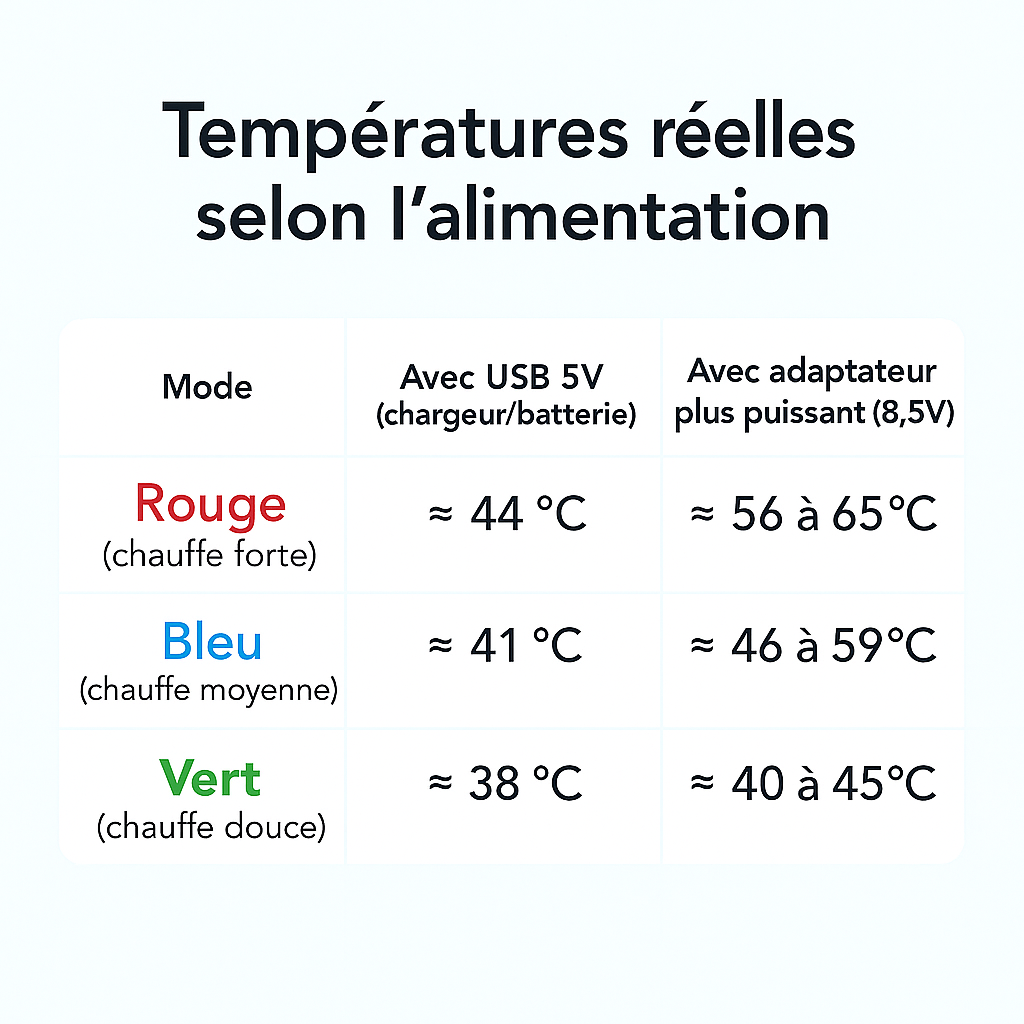 Si vos douleurs sont légères ou occasionnelles, un chargeur 5V/1A suffit pour une chaleur douce et relaxante, idéale pour entretenir la mobilité articulaire au quotidien.
